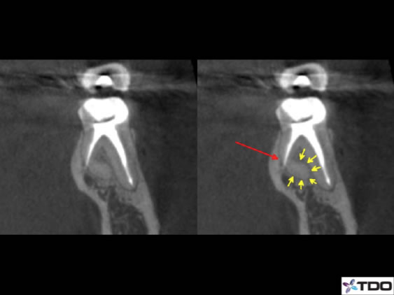 Figure 3: This is a coronal slice view of the DL canal of a lower molar with severe curvature towards the buccal. A perforation is detected at the elbow of the curvature.