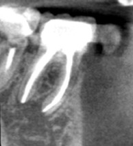 Fig 3b. Coronal CBCT slice of the same tooth revealing a missed buccal canal and an associated apical radiolucency. (1)