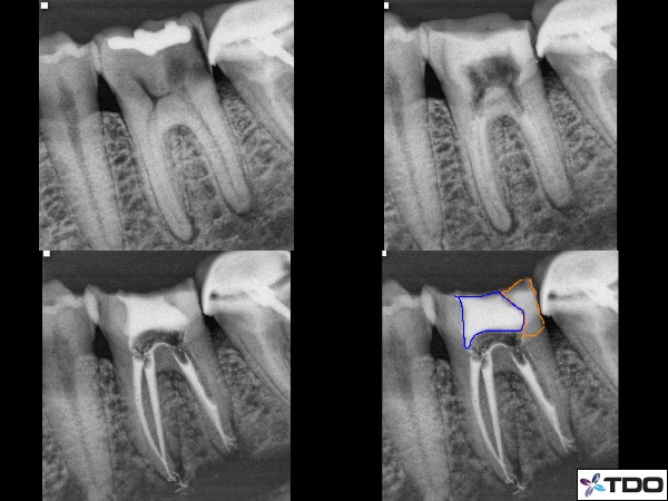Fig. 2: The upper left x-ray is the presenting condition of the tooth. There was recurrent decay at the distal margin, thus I removed the crown to remove the decay and retreat the tooth. I rebuilt the tooth with composite and then reaccessed with 3 separate access points occlusal. This allowed for more bulk of build-up material. You can see the temporary material in the separate access points for each canal. I also roughly prep’d the tooth for crown work. The lower left x-ray shows the condition with a post and a temporary crown in place. In this case the pre-endodontic build-up was used as the final build-up for the crown.