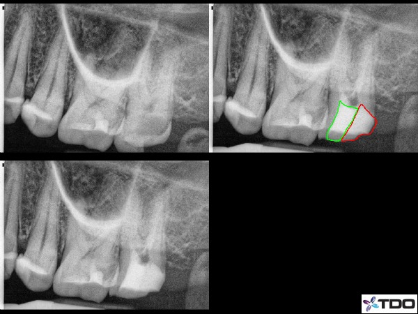 Fig. 4: Here is a case I started RCT on today (4/3/13 and thus no completion x-ray as the patient returns in a couple weeks for the finishing appointment). But this patient has a very small mouth and the decay was involving the distal and distal-buccal walls. Getting great isolation and no contamination with the location of decay and with a limited mouth opening was tough. In this case the pre-endodontic build-up took about twice as long as the shaping and irrigation of the canal spaces (4 canals). There is calcium hydroxide in the canals currently. Red indicates the general location of the pre-endo build-up and the green is a temporary restorative material in the access point.