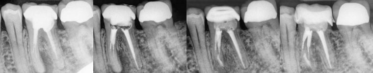Figures 15,16,17,18: pre-op / post-op retreatment / post-op apicoectomy / 13 month recall