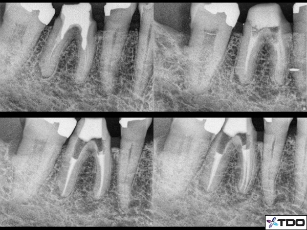 Figure 2: Here is a retreatment case from Adam Monroe in which a multi-visit (3) process was critical based on the difficulty of removing the amalgam posts in the canals. He also needed to properly shape the canals to the terminus and build the coronal tooth with composite for better protection and stability. The upper left shows the pre-operative condition. Upper right is with the coronal build-up in place and Ca(OH)2 in the canals. The bottom x-rays show two immediate post-operative pictures with a temporary filling in the access point.