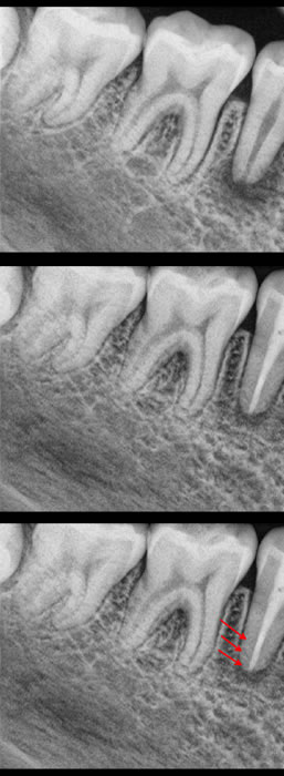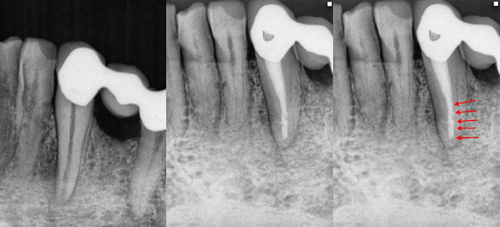 Figure 2: Pre-op radiograph with an apical lesion and an “open” apex. A very important canine tooth and part of a bridge. Figure 3: The immediate post-op following 2.5 months of CaOH treatment. Figure 4: Red arrows indicating the MTA location with gutta percha packed on top of the MTA. There is already a noticable healing response occuring apically as well.