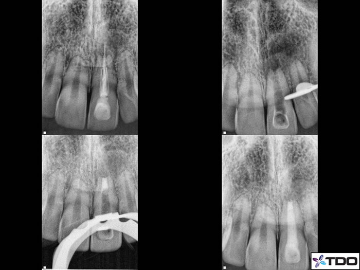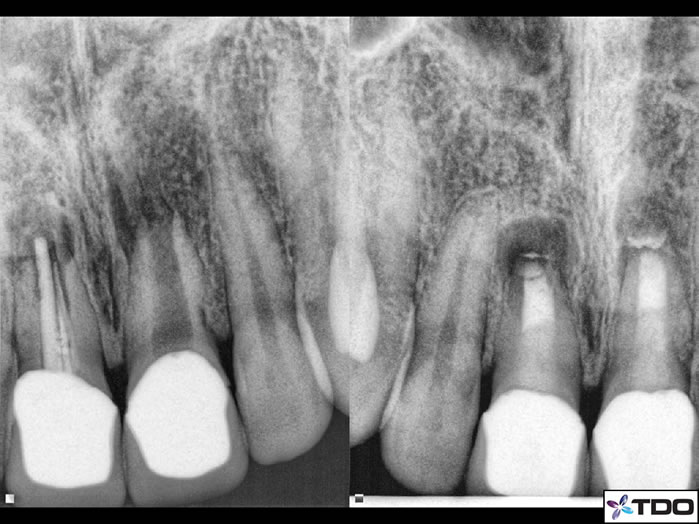 Figure 5: This case was just finished by Dr. Sherman. The pre-op shows wide open apices with tooth #8 having received inadequate original endodontic treatment. Tooth #9 is necrotic with incomplete apical formation. MTA is packed in the apical 4mm and a bonded fiber post over the top of the MTA.