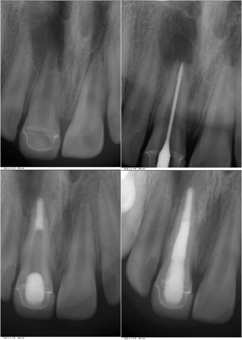 Figure 6: I completed this case a couple years ago. the pre-op with over instrumented and over filled RCT in the upper left. The upper right is with all materials removed. The lower left is with MTA in the apical section. And the lower right is the completed case with bonded post/composite seal.