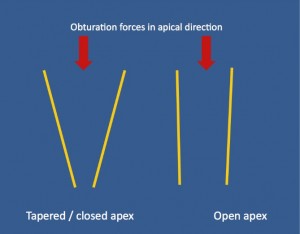 As you can image fitting a gutta percha cone to a well tapered apical shape of perhaps 25, 30, 35, etc will result in a predictable obturation with gutta percha and sealer. In ideal conditions of apical shape we can compact the gutta percha master cone with a warm vertical compaction method. The apical taper of the canal and the snug fit of the master cone will limit any expression of the gutta percha outside of the apex. But if in the situation with an “open” apex without apical taper that compaction technique with gutta percha and sealer will result in over-extension of the gutta percha material. In these cases, the concept of shape and taper, and compaction forces will determine the material that should be used (gutta percha vs. MTA). (see figure 1) Thus, changing the obturation method and using MTA makes the most sense. Especially considering that we do achieve the improved seal and do promote bone formation/deposition. (see figure 2,3,4 of the lower canine)