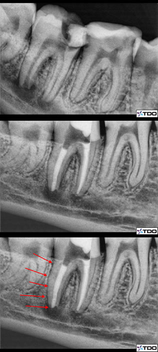 Figure 8: Root end resorption on a necrotic case. Following proper canal disinfection I packed MTA in the apical 4mm (red arrows). I then placed gutta percha in the rest of the canal and sealed coronally with composite.