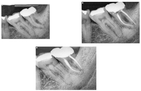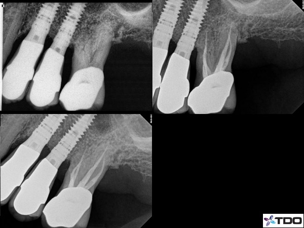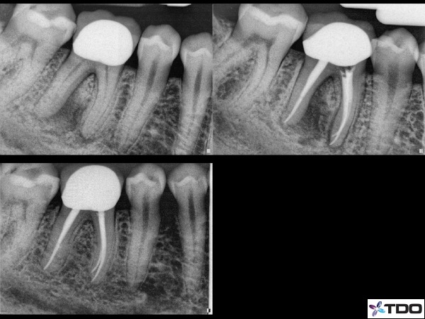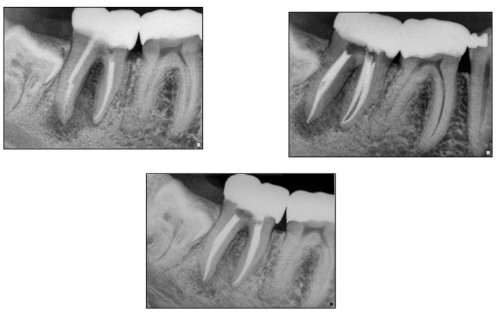 Fig. 3 This was a retreatment case by Dr. Sherman in which he medicated the canals over 3 appointments using CaOH. The upper left is the pre-operative x-ray. Upper right is the immediate post-operative x-ray and the lower x-ray is the 1 year recall. There has been significant bone fill into the furcation which will continue to improve over time.