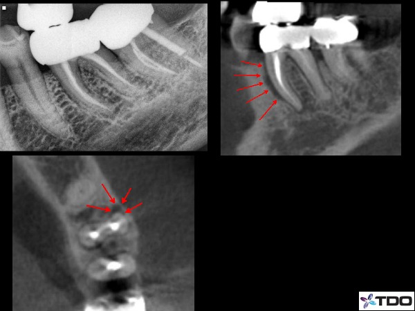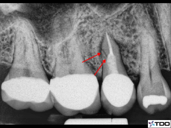 Fig. 4 Clear vertical root fracture illustrated with red arrows. Note: it is rare to see radiographic confirmation of a fracture.