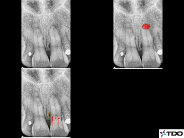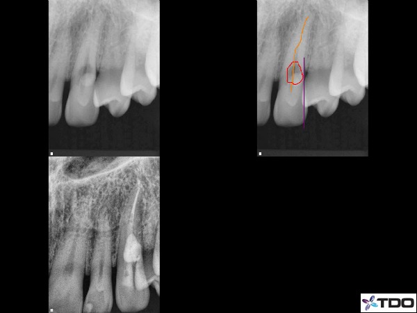Fig.7 This lateral root lesion appears near the crestal bone level on the mesial side of tooth #9. The illustrations in orange and red show the lesion and a horizontal root fracture.