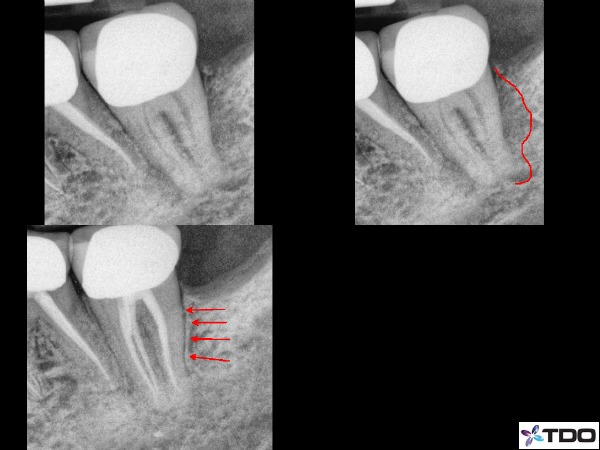 Fig.5 This is a case that needed endodontic treatment, but also had the a separate issues of periodontal disease resulting in horizontal bone loss. I do not believe in this case one problem was contributory towards the other. He had generalized horizontal bone loss around all of his teeth. I performed the RCT and the lower right is a 6 month recall. The patient remains asymptomatic.